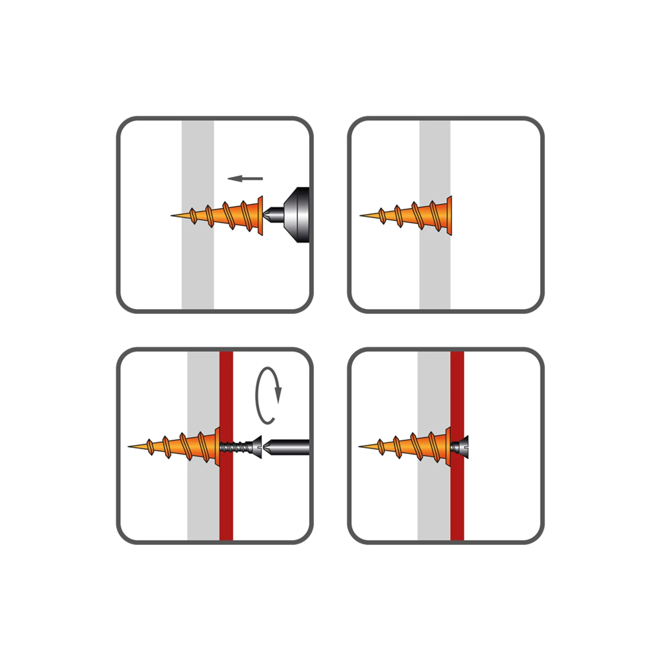 Hmoždinka se pomocí montážního přípravku zařízne do sádrokartonové desky. Materiál se upevní pomocí vrutu.